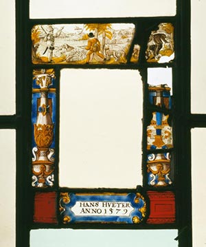 Fragment einer Wappenscheibe des Hans Hüter (Hueter), von einem Säulenpaar gerahmt, im Oberlicht eine Jagdszene nach Jost Amman. Pendant zu Gm.128, der Wappenscheibe seiner Ehefrau Ursula Stromer von Reichenbach |