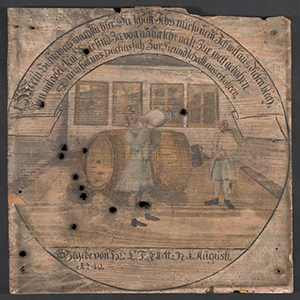 Werktitel: | Coburger Schützenscheibe, gestiftet von L.F. Effelt am 1.8.1740, darstellend zwei Männer in einer Trinkstube vor einem Fass | |||