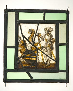 Glas, blassgrünes Antikglas (Randstreifen), Schwarzlot, Silbergelb |