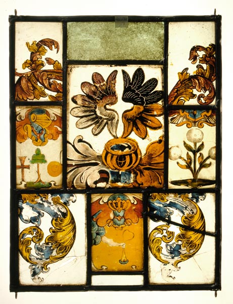 | Technik: | Glas, Schwarzlot, Silbergelb, Eisenrot, Schmelzfarben | |||