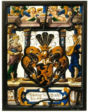 Werktitel: | Wappenscheibe des Volckmar von Brassenburg mit den Personifikationen des Gesichts- und Hörsinns in Architekturrahmung. Sammlung der Herzöge von Sachsen-Coburg und Gotha, ehemals in Schloss Rosenau (vgl. Gm.001, 002, 012, 055, 058, 059, 060, 061) | |||