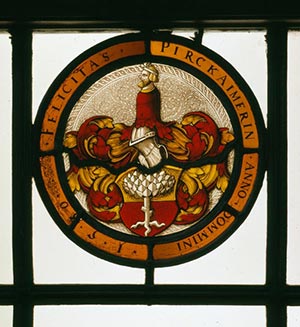 | Werktitel: | Wappenscheibe der Felicitas Pirckheimer "1530", Tochter von Willibald Pirckheimer und Ehefrau von Hans VI. Imhoff. Zugehörig zu einem Zyklus von vier Wappenscheiben Nürnberger Patrizierinnen aus den Familien Imhoff und Pirckheimer, vgl. Gm.041, 071, 082, 113 | |||