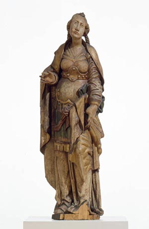 | Werktitel: | Kreuzigungsgruppe: Stehende weibliche Heilige (Maria Magdalena?), bekleidet mit römischem Brustpanzer (Lorica) und Mantel | |||