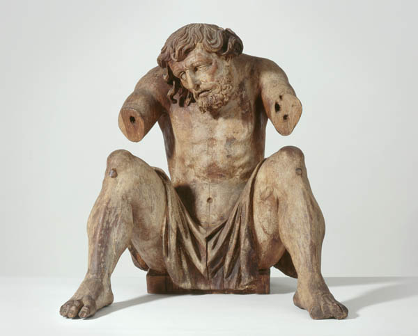 Atlant: Mann im Lendentuch, mit gespreizten Beinen und angezogenen Knien hockend, die Füße und den nach links geneigten Kopf gegen eine Last stemmend. Die nach oben stützenden Arme fehlen. |