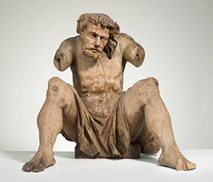 Atlant: Mann im Lendentuch, mit gespreizten Beinen und angezogenen Knien hockend, die Füße und den nach rechts geneigten Kopf gegen eine Last stemmend. Die nach oben stützenden Arme fehlen. |